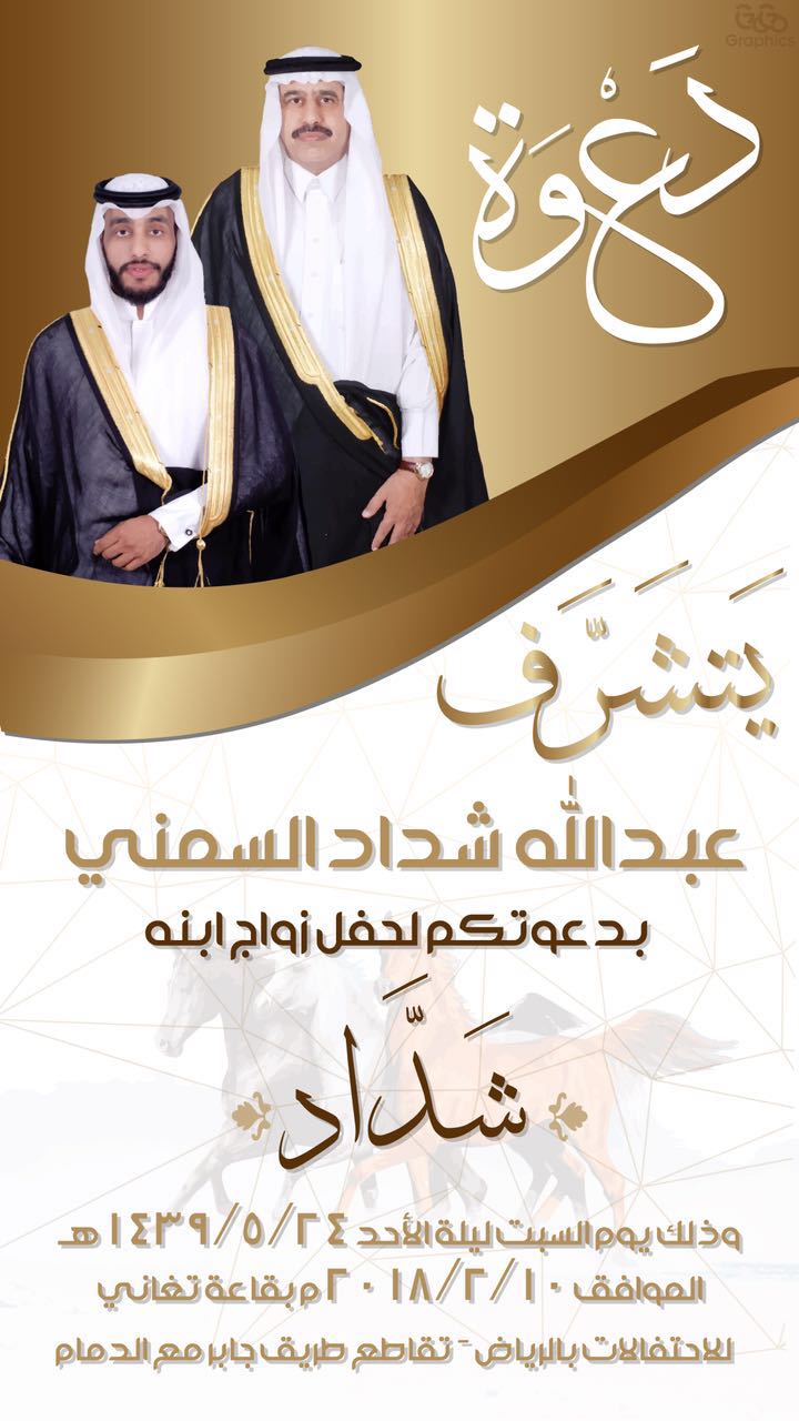 يحتفي الشاب شداد بن عبدالله بن شداد السمني الشلاحي بزواجه مساء يوم السبت القادم الموافق 1439/5/24 بقاعة تغاني للاحتفالات بالرياض تقاطع طريق الشيخ جابر مع طريق الدمام وبهذه المناسبة نتقدم له ولوالده بخالص التهاني والتبريكات متمنين له التوفيق والسداد